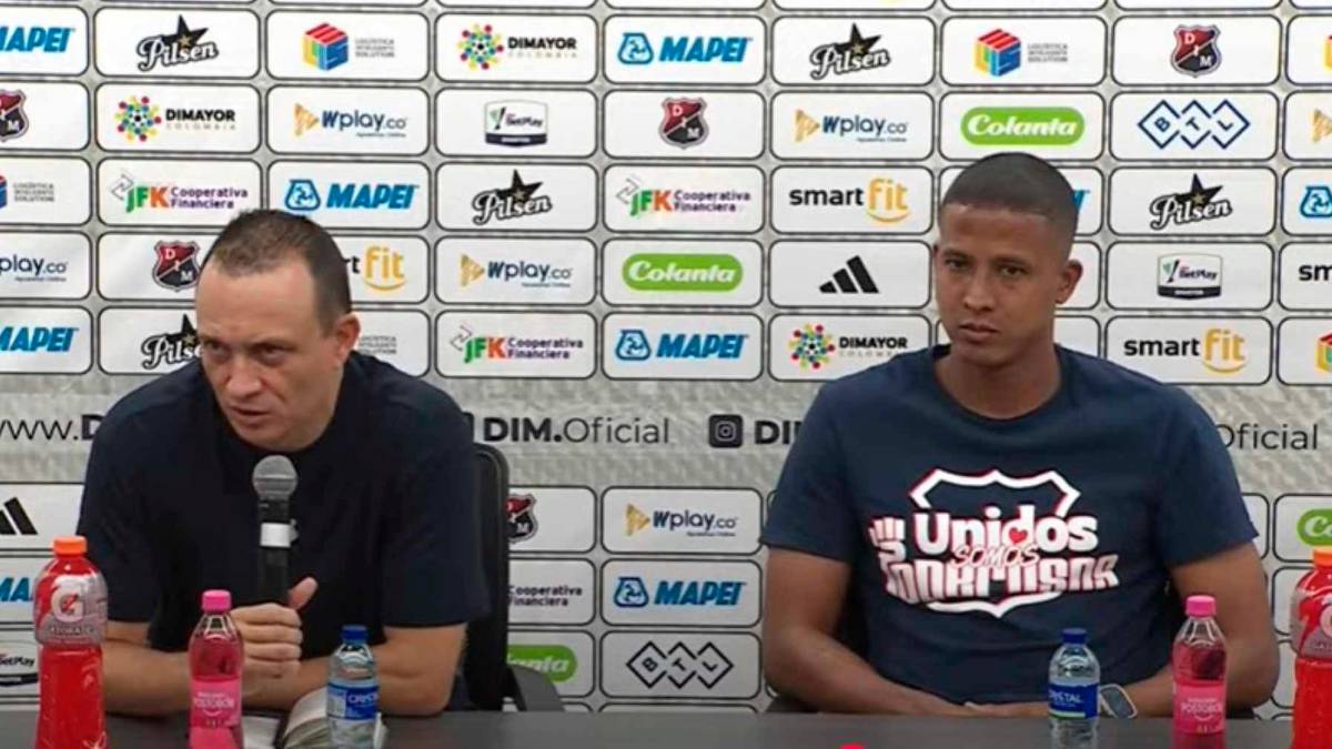 El técnico Alejandro Restrepo y el capitán del rojo, Fainer Torijano en la rueda de prensa, tras la victoria 1-0 sobre Millonarios. FOTO PANTALLAZO