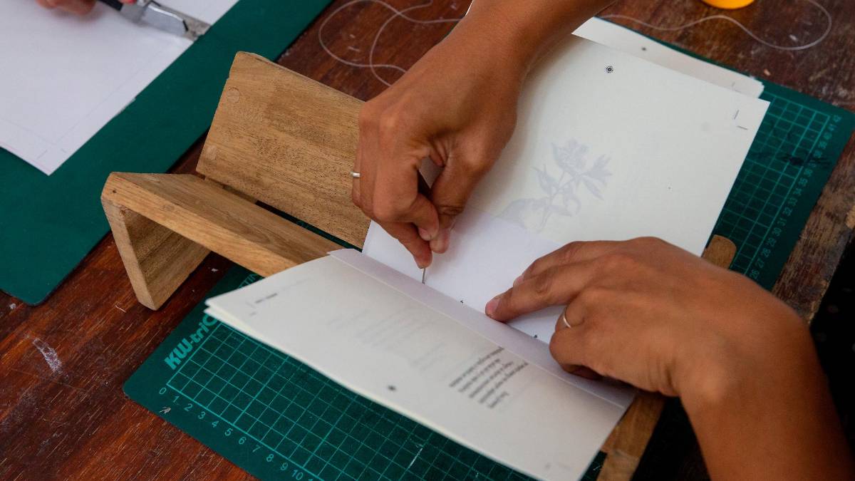 En el Taller Talante hay amor por las cosas bien hechas, de ahí que mezclen tecnología y arte para crear libros dignos de adornar las bibliotecas, incluso los museos, pues suelen trabajar con artistas plásticos. Su proceso inicia con la llegada del papel, que necesariamente es importado, “porque el producido localmente es poco y se lo llevan otras industrias”, explica Yeison Cañaveral, ingeniero de materiales. La producción nacional se hace en el Valle del Cauca, a partir de las fibras de la caña de azúcar. En los últimos años, otro sustrato que plantea alternativas más ecológicas es el cáñamo, que todavía no se usa para esos fines en Colombia, pero cuyo cultivo es más eficiente en el uso de recursos naturales porque crece más rápido.