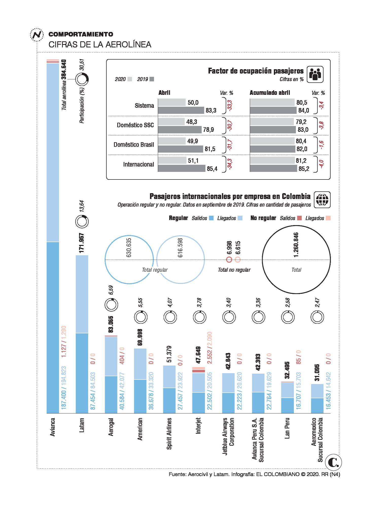Hablando de Colombia, Latam aparece como segundo jugador de la industria aérea con el 19,3 % del total de pasajeros nacionales movilizados (pues sumó 3,3 millones), y el 14,3 % de los internacionales con 1,2 millones, solo por detrás de Avianca, según el registro de la Aeronáutica Civil a corte de septiembre del año pasado.